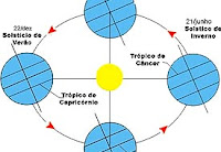 A figura acima ajuda a compreender o fenômeno. Para dar uma volta ao redor do Sol, a Terra leva 365 dias e mais seis horas. Durante essa viagem, a inclinação do eixo não muda e sempre parece apontar para a mesma posição no espaço. Essa inclinação, que é de 23.5 graus, faz com que os hemisférios recebam a incidência de raios solares de forma diferente durante o ano.
