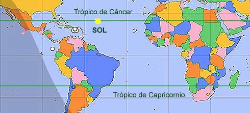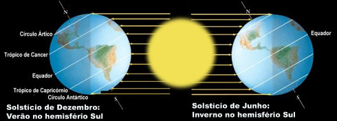 As linhas dos trópicos de Câncer e Capricórnio vistas em um mapa foram definidas em função dos solstícios. Durante o solstício de inverno no hemisfério Sul os raios de Sol incidem perpendicularmente à Terra na linha do trópico de Câncer, lá no hemisfério norte. Isso se inverte no mês de dezembro, quando ocorre o solstício de verão no hemisfério Sul. Neste dia os raios solares atingem a Terra perpendicularmente à linha do trópico de Capricórnio.